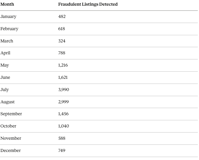 The summer months of June through August combined for 8,610 detections, representing 54% of all fraud activity for the year. Compare that to the quieter winter months where January saw 482 detections and March bottomed out at just 324. Scammers clearly know when demand is highest and tenants are most desperate to lock down a lease.