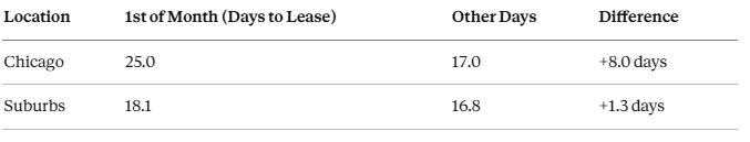 In the suburbs, first-of-month move-ins barely move the needle, just 1.3 extra days to lease. But in Chicago, the penalty is 8 full days. That's dramatic.