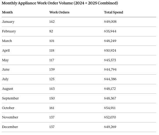 55% of all appliance work orders in our data landed between July and December. If you're going to have a rough stretch on the appliance side, this is when it's going to happen. Smart investors make sure they have cash reserves built up heading into summer rather than scrambling in October when three units need attention in the same week.