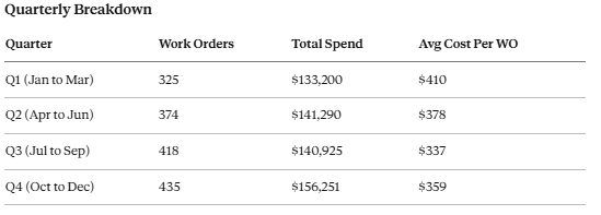 Q4 leads in total volume (435 work orders) and total spend ($156,251). But Q3 is right behind it at 418 work orders. Between July and December, we handled 853 of the 1,552 appliance work orders in the data. That's 55% of the year's appliance activity packed into the back half of the calendar.